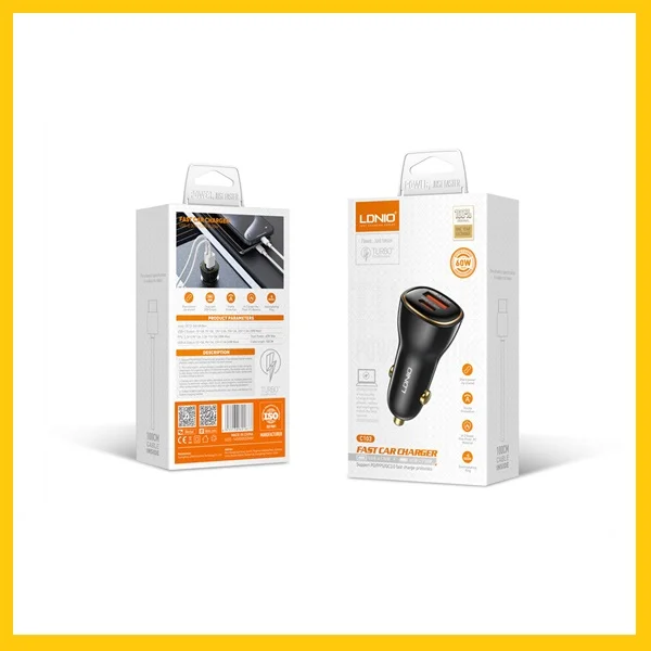 شارژر فندکی الدینیو C103 با کابل یو اس بی به تایپ سی 60 وات