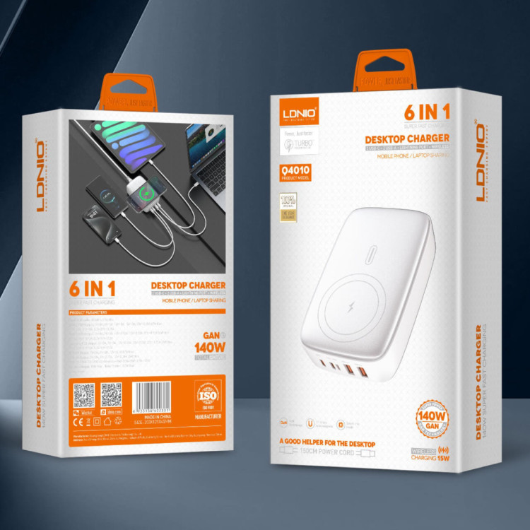 اگر بهجای چند شارژر جدا، یک هاب شارژ قدرتمند، مرتب و مدرن میخواهی، شارژر رومیزی الدینیو GaN-6in1 Q4010 توان ۱۴۰ وات انتخابی عالی است: ۶ خروجی، تکنولوژی GaN، توان بالا، ایمنی کامل و مناسب برای میز کار حرفهای، خانه و سفر.