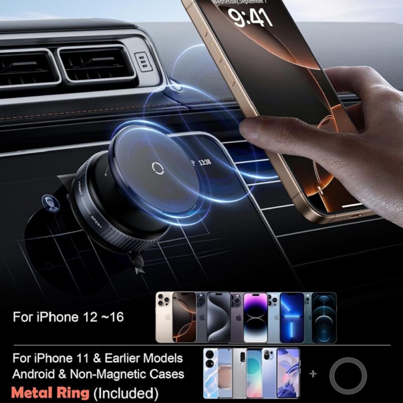 【مگنت روبیدیوم قوی دو سیم پیچ N۵۲】 این نگهدارنده تلفن همراه برای خودرو دارای یک حلقه مغناطیسی دو لایه قدرتمند با الگوی دایره ای دقیق ۱:۱ برای اتصال پایدار و ایمن است. حتی در هنگام ترمزگیری ناگهانی، نیروی مغناطیسی ۱۸N تقویت شده تلفن شما را محکم در جای خود نگه می دارد.