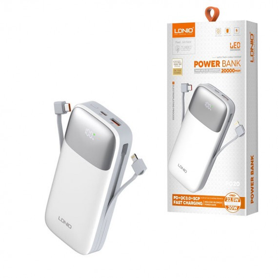 کمپانی LDNIO در دنیای لوازم جانبی کاملا شناخته شده است و شهرت این برند ، در کیفیت ساخت بسیار بالا و همچنین مجهز بودن به تکنولوژی و امکانات روز است. تمامی محوصلات این برند در فروشگاه های معتبر سراسر دنیا اهم از آمریکا و اروپا و ... به فروش می رسد و محصولات متععدی ازین برند در سایت آمازون نیز به چشم می خورد. پاوربانک الدینیو PQ20 جدیدترین پاوربانک کمپانی LDNIO و یکی از زیباترین ، خوش ساخت ترین و مجهزترین مدل ها این برند محصوب می گردد. طراحی شکل ظاهری به شدت جذاب و چشم و نواز است. متریال بی نظیر ، کیفیت ساخت بالا ، خوش دست بودن و ظاهر حرفه ای این محصول ، از دیگر مزایای این کالا در نگاه اول است. به بدنه ، 2 نوع کابل متصل است ، تا کاربر را از به همراه داشتن کابل های متعدد بی نیاز سازد. در بالای پاوربانک 1 درگاه ورودی Type-C قرار گرفته که می تواند پاوربان را بصورت FAST شارژ نماید. در کنار آن 1 درگاه خروجی USB نیز تعبیه شده است. بر روی پنل جلویی ، نمایشگر LCD برای نماش درصدی شارژ باقی مانده در پاوربانک قرار دارد که به زیبایی و جذابین این محصول نیز ، می افزاید. کابل Lightning ( اپلی ) متصل به بدنه ، دارای توان 20 وات است تا برای شارژ نمودن جدیدترین موبایل های شرکت APPLE نیز کارآمد باشد. کابل Type-C ( تایپ سی ) متصل به بدنه ، دارای خروجی 22.5 وات است تا این کابل نیز ، برای طیف گسترده از انواع دستگاه ها مانند ؛ موبایل ، تبلت ، هدفون ، ساعت هوشمند و ... ، از تمامی برند ها کارآمد باشد.