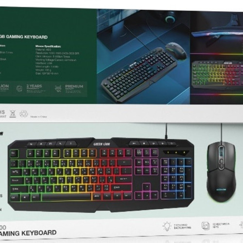کیبوردو ماوس گیمینگ گرین GK-400- این محصول شامل یک ماوس و کیبورد بسیار جذاب و زیبا است که برای گیمینگ و استفاده ی روزمره مناسب می باشند. این ماوس و کیبورد از جنس ABS ساخته شده اند و هر دو دارای کابل USB به طول 1.5 متر می باشند. طول عمر کلیدهای کیبورد برابر با 10 میلیون کلیک بوده و طول عمر کلیدهای ماوس، 5 میلیون کلیک می باشد. کیبورد دارای ولتاژ 5 ولت و شدت جریان کمتر از 300 میلی آمپر است. موس نیز ولتاژ 5 ولت و شدت جریان 100 میلی آمپر دارد. این دو محصول، مجهز به چراغ های RGB جذاب با 7 رنگ نور هستند که زیبایی خیره کننده ای به اتاق گیمینگ و میز کار شما می دهد. این نورها قابل تنظیم هستند و می توانید آن ها را مطابق با سلیقه خود تنظیم نمایید.