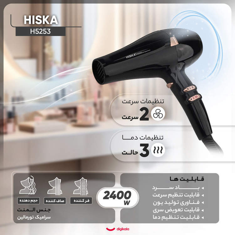 سشوار هیسکا مدل H5253 سشواری حرفهای و مناسب کار در آرایشگاه است که دارای موتور 2400 وات AC، با فناوری تولید یون و دو متمرکز کنندهی هوا است. این مدل سشوار، از قوی ترین سشوارهای موجود در بازار محسوب می شود و حرارت بالای آن به همراه قدرت پرتاب بالای آن میتواند این محصول را به یکی از ایده آل ترین سشوارهای مخصوص براشینگ تبدیل کند. فناوری تولید یون در این سشوار به صورت خودکار است و با روشن شدن دستگاه شروع به کار می کند. این یونها با باد سشوار خارج میشود و پس از برخورد به موها الکتریسیته ساکن روی آنها را از بین میبرند. بهاینترتیب وز شدن مو کمتر اتفاق میافتد و حالت دادن به موها هم راحتتر میشود. این سشوار حرفهای دارای دو متمرکز کنندهی هوا با اندازههای مختلف است که با توجه به نیاز میتوان از یکی از آنها استفاده کرد. فیلتر ورودی هوا را میتوان به شکل چرخشی جدا کرده و آن را شست. بهاینترتیب علاوه بر اینکه قدرت باد سشوار حفظ میشود، عمر آن هم افزایش مییابد. برای حالت دادن و خشککردن موها میتوان سرعت و حرارت باد را روی مقدار دلخواه تنظیم کرد. برای این کار باید از دکمههای روی دسته استفاده کرد که دو حالت سرعت متوسط و زیاد و سه حالت حرارت سرد و گرم و داغ را فراهم میکنند. از دیگر ویژگیهای سشوار هیسکا مدل H5253 میتوان به سیم 3 متری و حلقهی آویزان کردن آن اشاره کرد که برای استفادهی در مکانهایی مانند سالنهای آرایشی ضروری هستند.