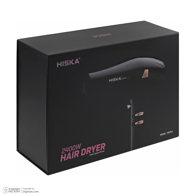 سشوار هیسکا مدل H5253 سشواری حرفهای و مناسب کار در آرایشگاه است که دارای موتور 2400 وات AC، با فناوری تولید یون و دو متمرکز کنندهی هوا است. این مدل سشوار، از قوی ترین سشوارهای موجود در بازار محسوب می شود و حرارت بالای آن به همراه قدرت پرتاب بالای آن میتواند این محصول را به یکی از ایده آل ترین سشوارهای مخصوص براشینگ تبدیل کند. فناوری تولید یون در این سشوار به صورت خودکار است و با روشن شدن دستگاه شروع به کار می کند. این یونها با باد سشوار خارج میشود و پس از برخورد به موها الکتریسیته ساکن روی آنها را از بین میبرند. بهاینترتیب وز شدن مو کمتر اتفاق میافتد و حالت دادن به موها هم راحتتر میشود. این سشوار حرفهای دارای دو متمرکز کنندهی هوا با اندازههای مختلف است که با توجه به نیاز میتوان از یکی از آنها استفاده کرد. فیلتر ورودی هوا را میتوان به شکل چرخشی جدا کرده و آن را شست. بهاینترتیب علاوه بر اینکه قدرت باد سشوار حفظ میشود، عمر آن هم افزایش مییابد. برای حالت دادن و خشککردن موها میتوان سرعت و حرارت باد را روی مقدار دلخواه تنظیم کرد. برای این کار باید از دکمههای روی دسته استفاده کرد که دو حالت سرعت متوسط و زیاد و سه حالت حرارت سرد و گرم و داغ را فراهم میکنند. از دیگر ویژگیهای سشوار هیسکا مدل H5253 میتوان به سیم 3 متری و حلقهی آویزان کردن آن اشاره کرد که برای استفادهی در مکانهایی مانند سالنهای آرایشی ضروری هستند.
